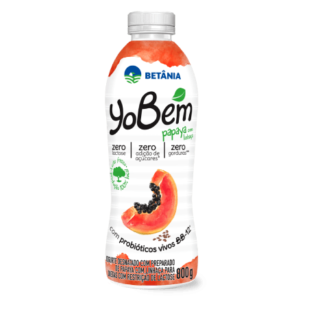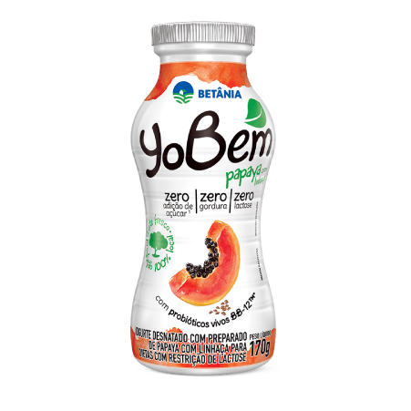 -Leite desnatado e/ou leite em pó desnatado reconstituído, preparado de papaya com linhaça: lágua, corante urucum, polpa de mamão, farinha de linhaça, pectina, conservante sorbato de potássio, amido, aroma natural de mamão, acidulante ácido cítrico, sucralose, acessulfame de potássio) soro de leite em pó, amido modificado, pectina, probiótico Bifidobacterium animalil subsp. lactis, BB-12™M (DSM 15954), enzima lactase, fermento lático e edulcorante sucralose.